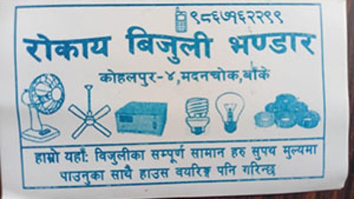 Rokaya Bijuli Bhandar हामीकहाँ ,पंखा,टर्च लाईट,मन्टी प्लक,बल्ब,तार, लगाएत बिजुलीका सम्पूर्ण सामानहरु सुपथ मुल्यमा पाईनुका साथै हाउस वाईरिङ्ग ,पंखाहरु मर्मत पनी गरिन्छ ।