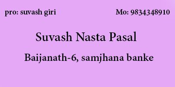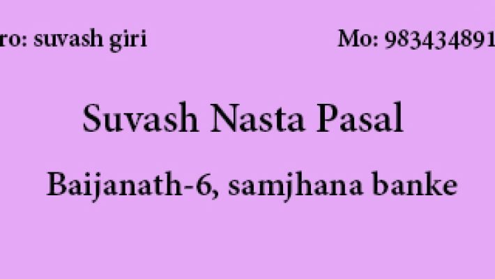 Suvash Nasta Pasal Suvash Nasta Pasal Restaurant 9834348910 Baijanath-6, samjhana banke Save Submit Review Share Share This Post: facebook twitter linkedin google pinterest Description हाम्राेयहाँ म:म, चाउमिन, भुटुवा, ललिपप, लेगपिस पाईनुका साथै अर्डर अनुसारका नास्ता तयार गरिन्छ। Maps Map Street View Get Directions Listing Amenities Bike Parking Parking Street Security Cameras Smoking Allowed Wireless Internet Photos Today Open SundayOpen All DayMondayOpen All DayTuesdayOpen All DayWednesdayOpen All DayThursdayOpen All DayFridayOpen All Day Close Statistic 163 Views December 30, 2024