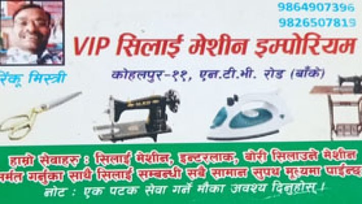 VIP सिलाई मेशीन इम्पाेरियम हाम्राे सेवाहरू सिलाई मेशिन ,इन्टरलक ,बाेरी सिलाउने मेशिन मर्मत गर्नुका साथै सिलाई सम्बन्धी सबै सामान सुपथ मुल्यमा पाईन्छ ।